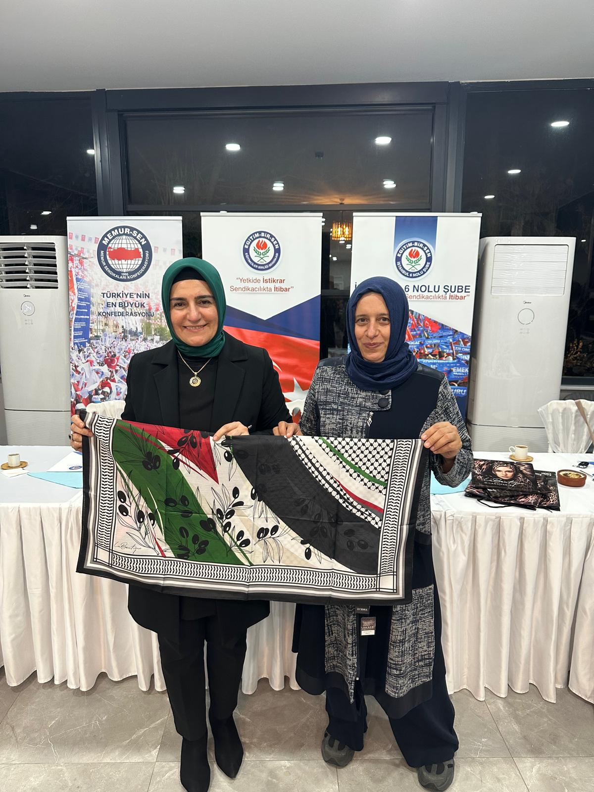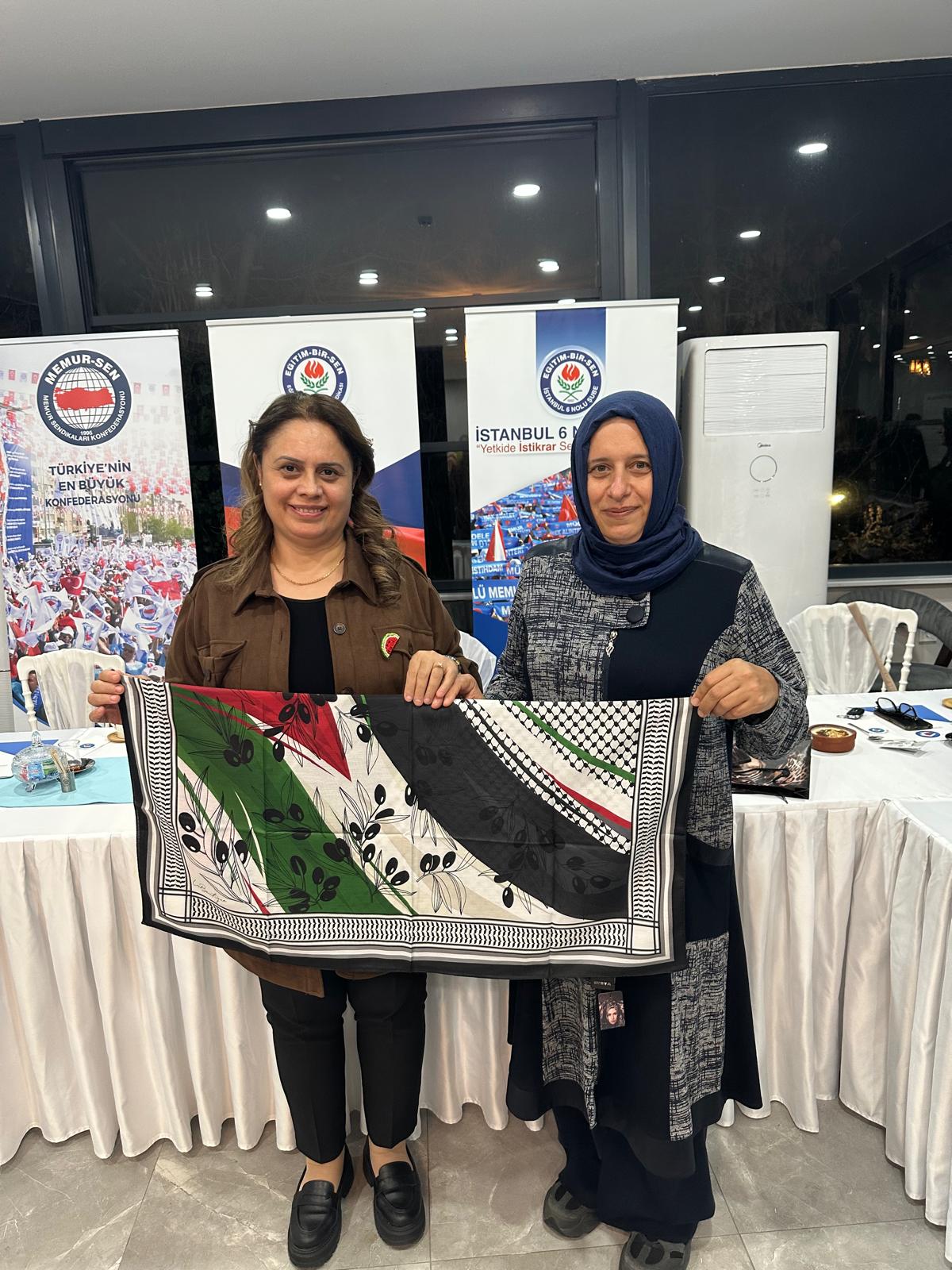 Program; soru-cevap faslının ardından Genel Merkez Kadın Komisyonu Başkanımıza takdim edilen Filistin sembollü şal hediyeleri ve hatıra fotoğraflarıyla sona erdi. Kadınların emeği, kararlılığı ve samimi katkılarıyla güçlenen bu buluşma, sendikal yolculuğumuza yeni bir ivme kattı.